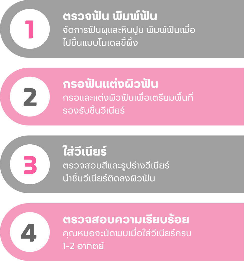 วีเนียร์ คือการเคลือบฟันโดยใช้เซรามิกบางใสที่ถูก ทำขึ้นตามสรีระฟันของแต่ละคน โดยทันตแพทย์จะแปะ วีเนียร์ที่ผิวด้านหน้าของฟัน ทำให้สีฟันสม่ำเสมอและ เรียงตัว สวยงามเป็นระเบียบ นอกจากนี้คุณสมบัติ พิเศษของการทำวีเนียร์ฟัน คือ ปกป้องฟันจากคราบ ชา กาแฟ และบุหรี่ โดยตัววัสดุเองสามารถเกาะยึด ผิวฟัน ได้เป็นอย่างดี ทำให้ฟันดูเป็นธรรมชาติ หากเทียบกับการตกแต่งฟันแบบอื่น ๆ